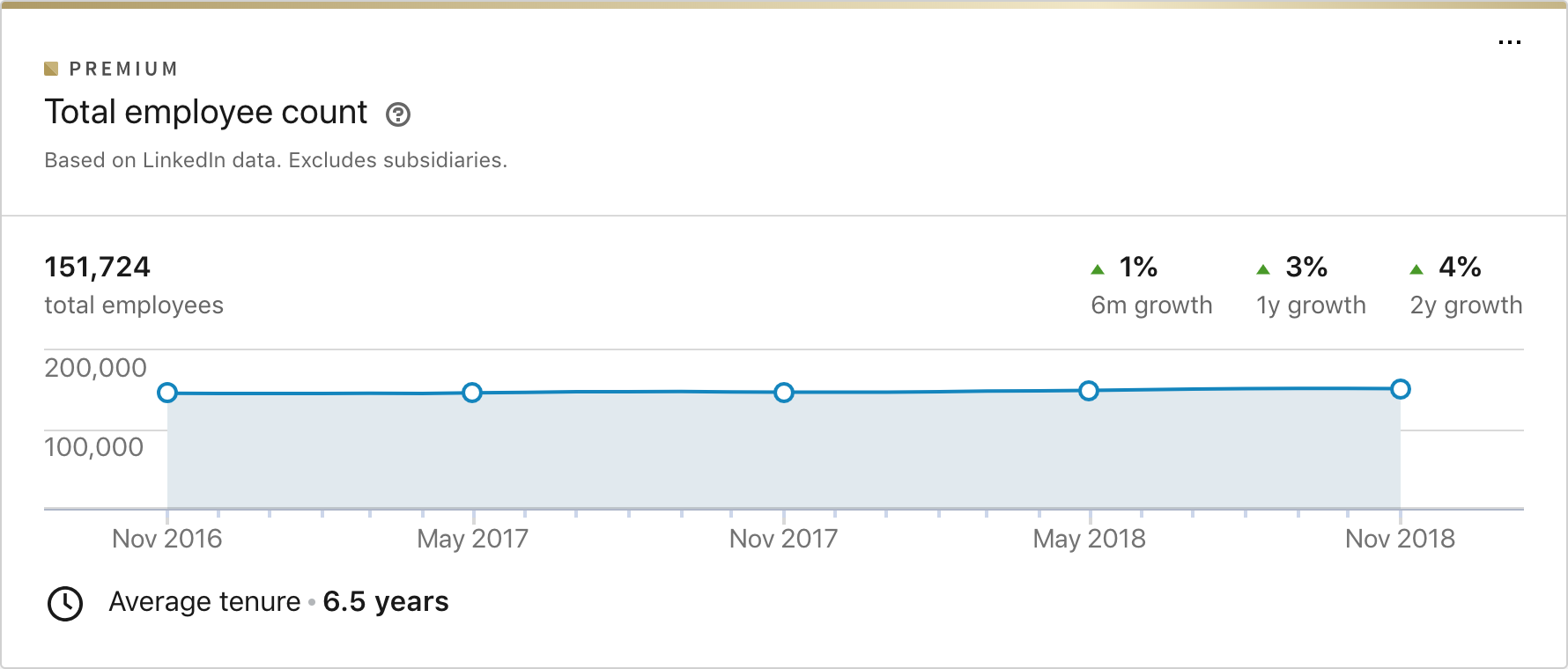 它還為您提供了六個月、一年和兩年的增長或下降率,並列出了員工的平均任期(以年為單位)。