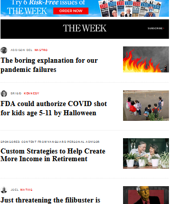 The Week 是一份每週新聞雜誌,報導對讀者而言重要的所有新聞的原創內容。 它的電子郵件時事通訊包含當天最佳文章、熱門漫畫和最佳新聞攝影等內容。