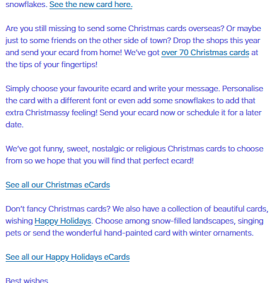 該公司的電子郵件通訊提醒客戶重要節日,消息中包含相關電子賀卡的便捷鏈接,促使讀者在幾秒鐘內發送問候。