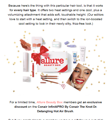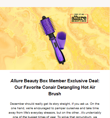 Allure 的電子郵件通訊以彩色照片為特色,吸引了讀者的注意力,主題行信息豐富,因此讀者確切地知道在消息中會發生什麼。