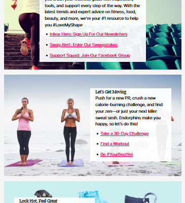 該出版物為讀者提供各種電子郵件通訊,包括專門針對健身、營養、食譜和相關產品的通訊。 它的內容以引人入勝的照片、鮮豔的色彩和易於閱讀的結構引人注目。