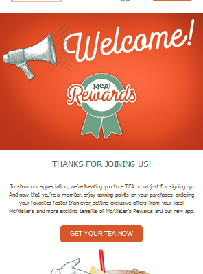 與許多公司一樣,McAlister's 會向新的時事通訊訂閱者發送歡迎電子郵件,並在問候語中包含其優惠券。 時事通訊具有號召性用語按鈕,便於在線訂購。