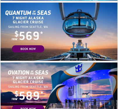 皇家加勒比的電子郵件通訊以引人注目的照片為特色,讓收件人想要閱讀更多內容。 一些時事通訊包括郵輪票的促銷和優惠,而其他時事通訊則提供對旅行者有用的信息內容。 時事通訊展示了大量的號召性用語按鈕,敦促讀者立即預訂。
