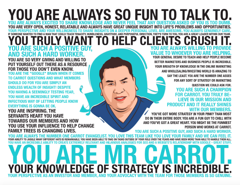 ......他將如何在下班後接聽 Carrot 客戶的電話以幫助他們取得成功,因為他知道當他們像他一開始那樣抓住它時,它可能會改變他們的生活。 他真的流血了“胡蘿蔔橙”,讓我們都變得更好。