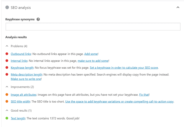 在 WordPress 世界中,Yoast SEO 是安裝在所有 WordPress.org 上的最常見的 SEO 插件。 安裝後,在頁面底部或帖子編輯器(默認情況下,這是 Gutenberg,但是,如果您使用的是主題構建器工具,它可能位於頁面下方),您可以啟用一整套用於添加的選項和編輯關鍵字。 正如您在下面的照片中所見,您將擁有的一些對話選項包括調整和輸入關鍵字、同義詞、Yoast 對網站的分析以及一些更方便的工具。