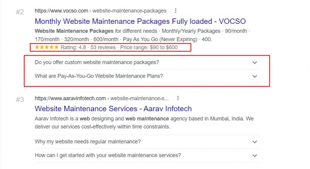 當我們談論豐富的結果時,您知道它們是什麼。 它們是超越標準藍色鏈接、標題和描述的 Google 平台上的體驗。 輪播是圖像的旋轉器,而圖像和其他非文本元素也被認為是豐富的結果。 現在是時候弄清楚如何讓您的網站被識別為豐富的結果。 借助豐富網頁摘要,您可以在 Google 搜索結果中的網站頁面中顯示很多有用的信息。 了解當我們使用關鍵字網絡維護包進行搜索時,我們的一個網站頁面如何獲取更多信息。 這是因為豐富的片段。