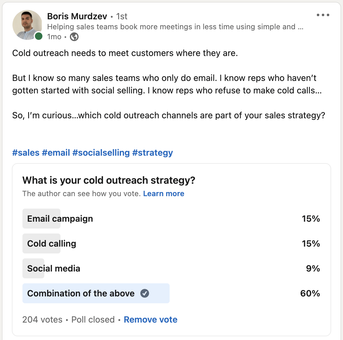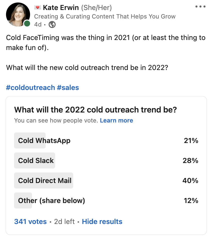 我對 LinkedIn 進行了調查(我知道,我很抱歉),以了解整個銷售社區認為 2022 年的大冷外展趨勢將是什麼,結果傾向於直接郵寄。