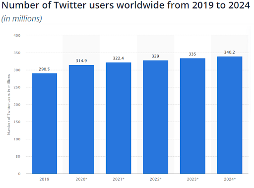 Twitter 用戶在 2019 年達到約 2.905 億; 到 2024 年,每月活躍用戶預計將增長到超過 3.4 億用戶。因此,說 Twitter 是領先的社交網絡和流行的營銷渠道之一併沒有錯。