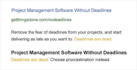 這個例子展示了一個被稱為對話動力的想法的各個方面,我們稍後會談到。 基本上,您可以看到副標題重複了廣告描述“截止日期……”的結尾,並以人們在戀愛蜜月期時所做的方式完成了句子。