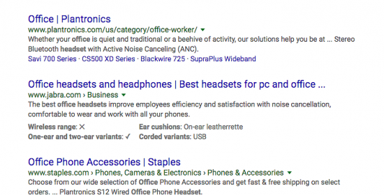 谷歌將表格拉入 SERP 的另一種有趣方式是通過增強的片段“模式”樣式。 但是,實際上不需要模式標記。 在搜索“辦公室耳機”時,您會注意到 jabra.com 設法以更大的片段排名: