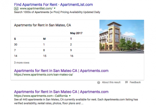 讓我們挖掘另一個你可能會走運的例子。 有時,Google 會誤解用戶意圖和表格意圖。 即使不需要,用戶也可以獲得直接應答表。 在這個著名的示例中,鍵入“apartments for rent”的用戶直接從 apartment.com 的日曆中拉出一張表,以直接回答查詢。 老實說,我不確定這實際上對 apartments.com 有多大幫助,但它肯定會提高他們的 SERP 知名度。