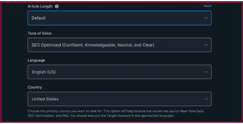 在此步驟中,您需要選擇您希望 AI 作家為您產生的文章長度。 在本節中,我們有文章長度、語氣、語言和國家。