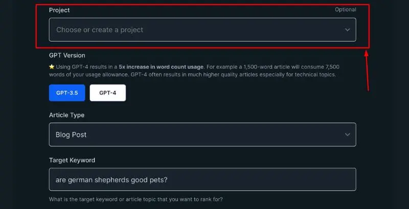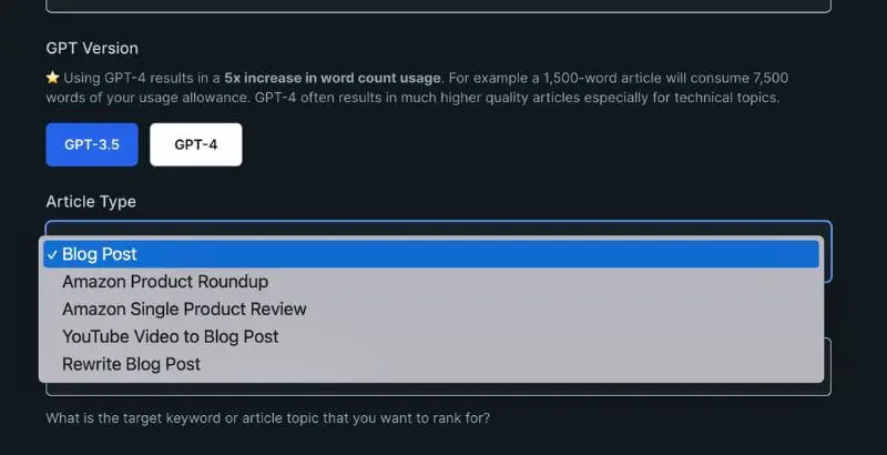 最後,在「文章類型」下方,您將看到一個選項,您可以在其中輸入要撰寫的文章的目標關鍵字。