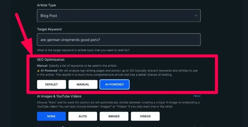 - 影片– 影片選項意味著當您選擇影片時,相關的 YouTube 影片將自動添加到文章中。 您也可以指定希望 AI 添加的影片數量。