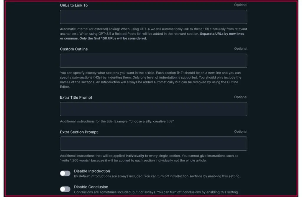 如果您想新增額外的標題提示或部分提示,您也可以在此處執行此操作。 最後,從這裡,您可以停用文章的介紹和結論。
