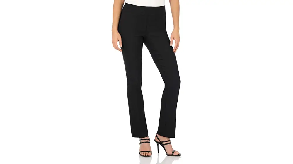 Rekucci 這款黑色直筒褲採用套穿款式,無拉鍊或鈕扣,腹部控制鑲片可增強自信。 寬闊舒適的輪廓腰帶、後省省和中腰設計確保緊密貼合,無任何凸出。